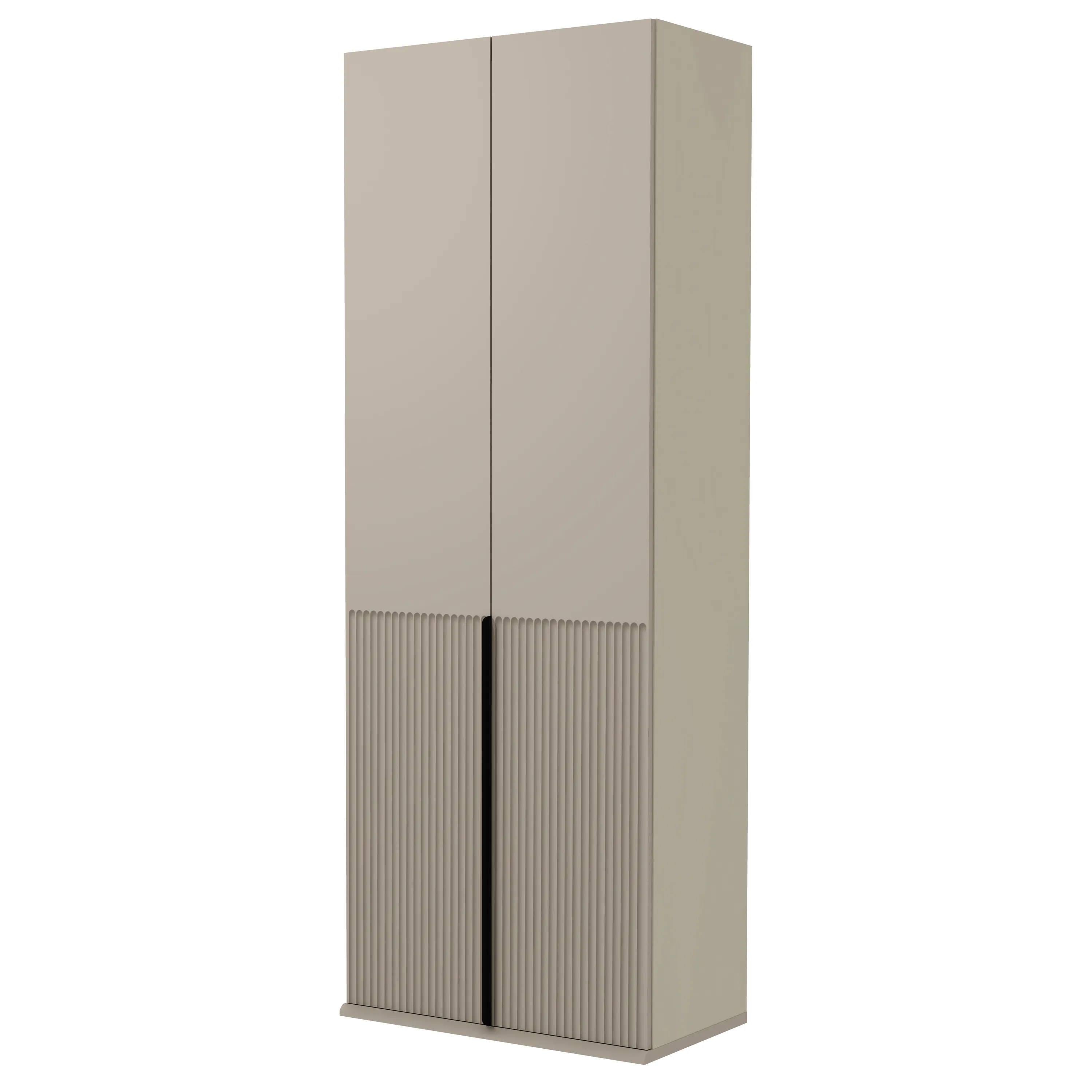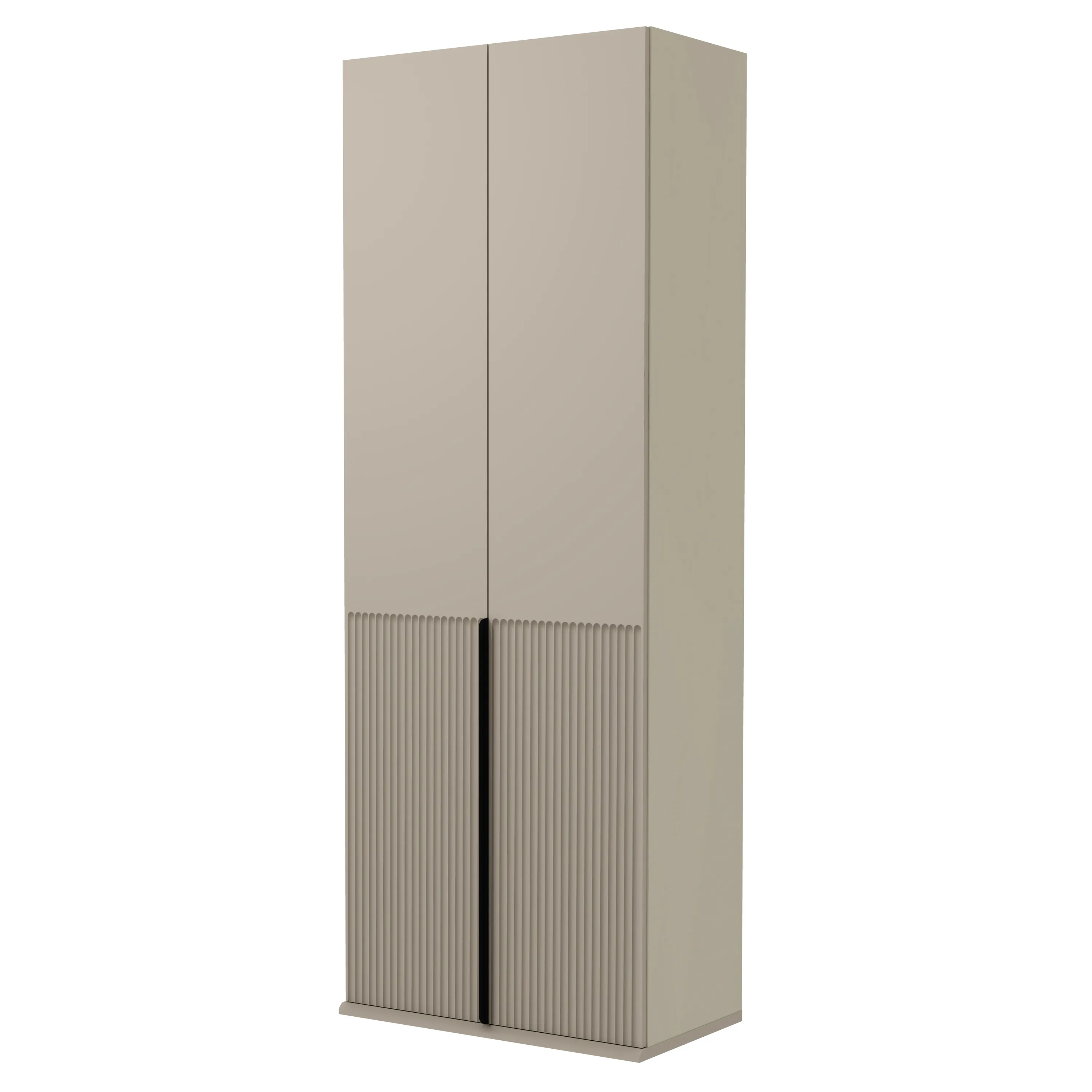 - Лицевая фурнитура высоких шкафов — вертикальные металлические ручки-профили с полимерным покрытием черного цвета. Остальные изделия оснащены выступающими фасадами с верхней скошенной гранью для комфортного открывания.
