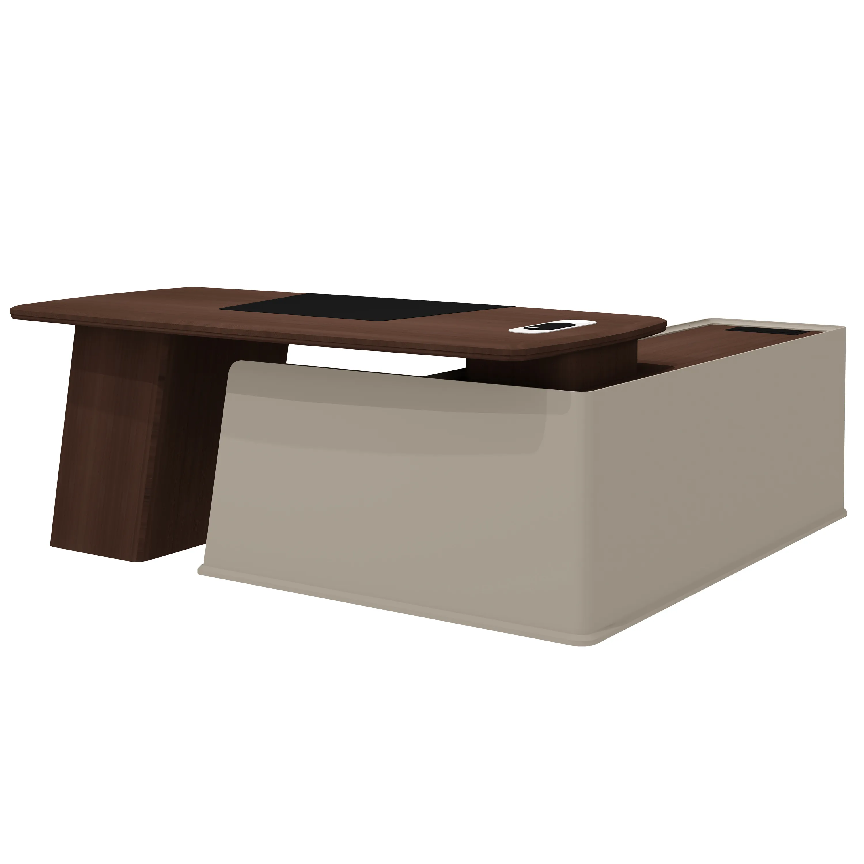 - Столы руководителя снабжены фигурными бюварами, обтянутыми черной экокожей.