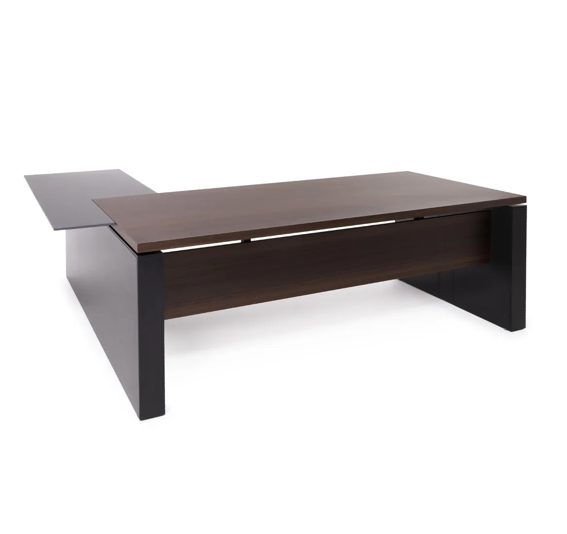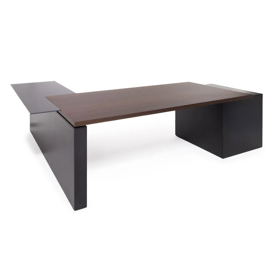 Материал столешницы письменного стола МДФ 39 мм, Покрытие шпон эвкалипта, Цвет эвкалипт мореный; эвкалипт светлый, Материал опоры стола черный матовый ЛДСП, Материал топа боковой приставки матовая компакт-плита толщиной 12 мм с фасками по внешнему краю
